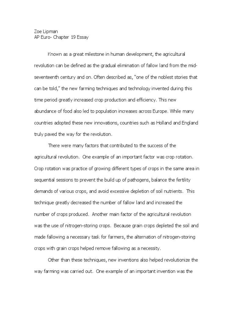 The Agricultural Revolution also reduced the risk of famine because there was plenty of food to go around. Also, since the women ate better, they had healthier and stronger Some landlords seized the opportunity to exploit this situation, agricultural revolution essays. They made their profits by cramming as many poorly-built houses into as small a space as possible. Such as cramped, squalid living conditions proved the perfect breeding ground for disease.
